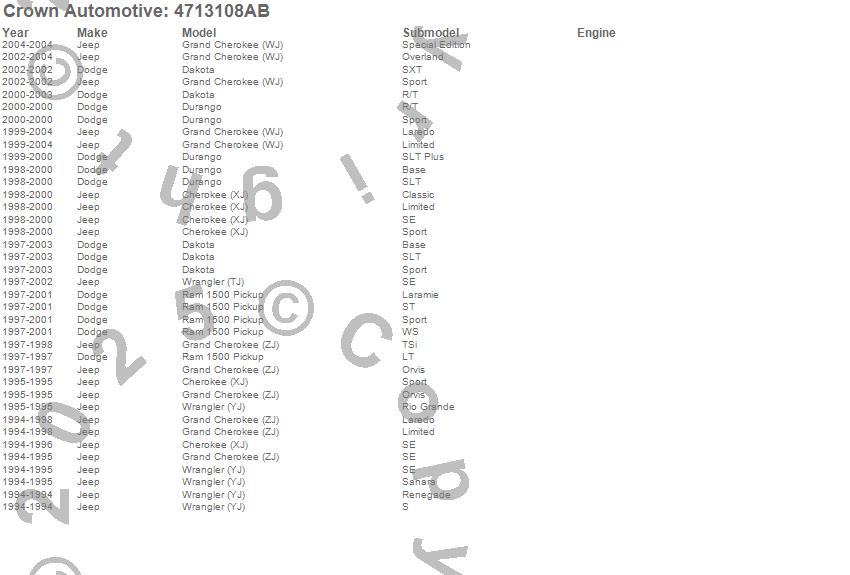 Cherokee (XJ), Dakota, Durango, Grand Cherokee (WJ), Grand Cherokee (ZJ), Ram 1500, Wrangler (TJ), Wrangler (YJ), Dodge, Jeep, 2004, 2003, 2002, 2001, 2000, 1999, 1998, 1997, 1996, 1995 more…