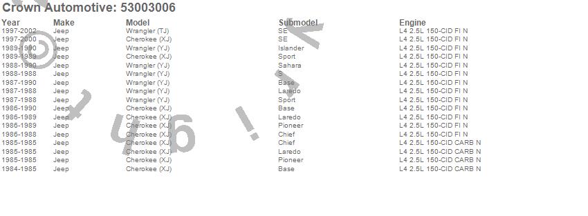 Crown Automotive is the premier manufacturer and distributor of quality replacement parts for Jeep® CJ™, Wrangler™, Cherokee™, Grand Cherokee™, Liberty™, and Commander™."From humble beginnings in 1963 in a small Boston storefront, Crown Automotive has consistently maintained its commitment to offering only quality parts and exceptional service. Today, with warehouses in Massachusetts, Georgia, Nevada, Spain, and the Czech Republic, totaling over 160,000 square feet, Crown Automotive continues to be the leader in quality replacement parts for Jeep® vehicles. With over 8,000 different parts in stock for Jeep® vehicles from 1942 on up, Crown has the largest stock of replacement parts for Jeep® vehicles, including factory-discontinued parts. In fact, many of the older Jeeps are still on (and off) the road thanks to Crown parts. The Crown line consists of axle, body, brake, clutch, cooling, driveline, electrical, engine, exhaust, fuel, steering, suspension, transmission and transfer case components. Crown Automotive also offers an exclusive line of component kits and accessory products. Because we know that Jeeps are driven harder than most other vehicles, we emphasize offering only quality parts. In fact, we test parts on Jeeps before distributing them to our dealers to insure that they meet our standards for quality. Crown also supports its entire line with a 12 month/12,000 mile warranty to insure our dealers and their customers of our commitment to offering quality parts. We know from experience that Jeep® owners would rather pay a little more for a good quality part that's backed by a strong guarantee. But we know that price is important as well. So, not only will you find Crown parts to be of exceptional quality, but you'll find them at a great price too.