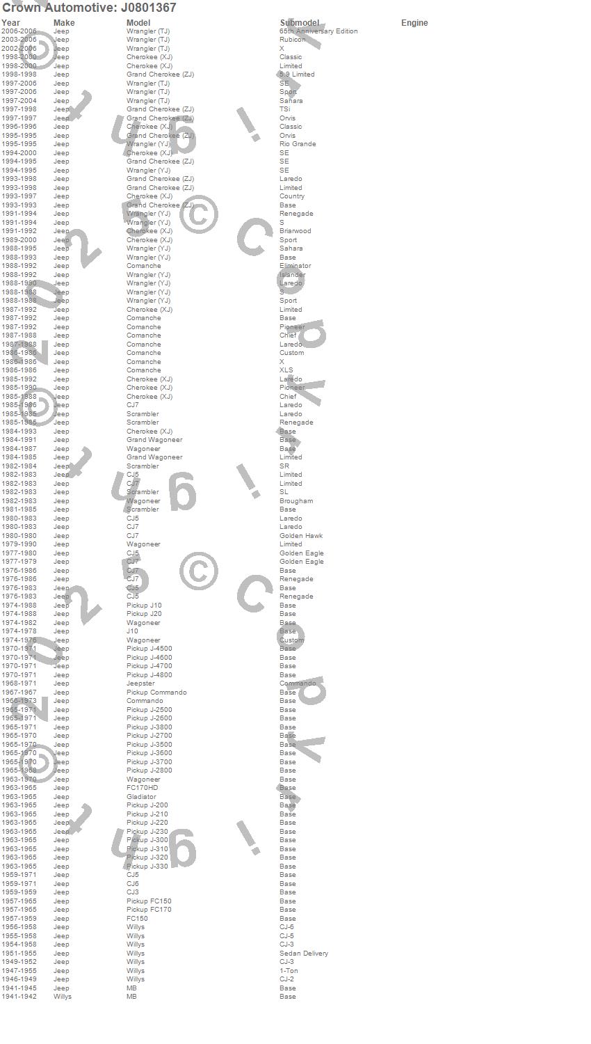 1-Ton Pickup, Cherokee (XJ), CJ-2A, CJ-3A, CJ-3B, CJ5, CJ6, CJ7, Comanche, Commando, FC150, FC170, FC170HD, Gladiator, Grand Cherokee (ZJ), Grand Wagoneer, J-200, J-210, J-220, J-230 more…