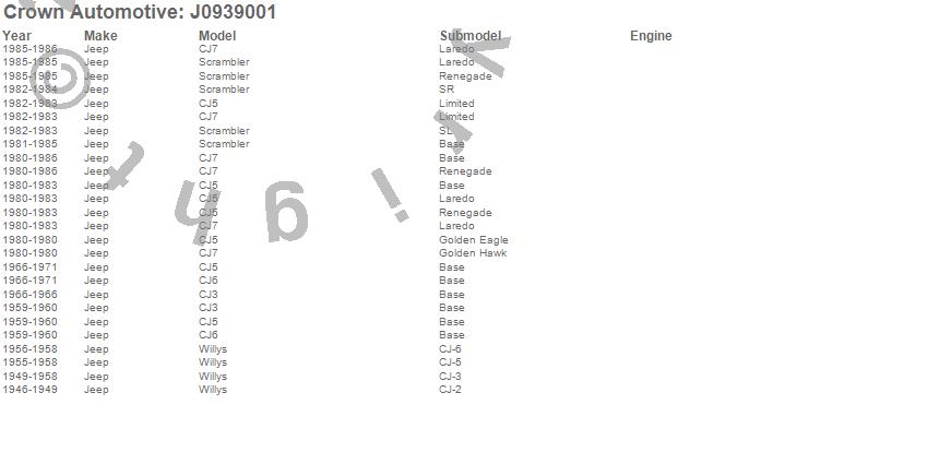Crown Automotive is the premier manufacturer and distributor of quality replacement parts for Jeep® CJ™, Wrangler™, Cherokee™, Grand Cherokee™, Liberty™, and Commander™."From humble beginnings in 1963 in a small Boston storefront, Crown Automotive has consistently maintained its commitment to offering only quality parts and exceptional service. Today, with warehouses in Massachusetts, Georgia, Nevada, Spain, and the Czech Republic, totaling over 160,000 square feet, Crown Automotive continues to be the leader in quality replacement parts for Jeep® vehicles. With over 8,000 different parts in stock for Jeep® vehicles from 1942 on up, Crown has the largest stock of replacement parts for Jeep® vehicles, including factory-discontinued parts. In fact, many of the older Jeeps are still on (and off) the road thanks to Crown parts. The Crown line consists of axle, body, brake, clutch, cooling, driveline, electrical, engine, exhaust, fuel, steering, suspension, transmission and transfer case components. Crown Automotive also offers an exclusive line of component kits and accessory products. Because we know that Jeeps are driven harder than most other vehicles, we emphasize offering only quality parts. In fact, we test parts on Jeeps before distributing them to our dealers to insure that they meet our standards for quality. Crown also supports its entire line with a 12 month/12,000 mile warranty to insure our dealers and their customers of our commitment to offering quality parts. We know from experience that Jeep® owners would rather pay a little more for a good quality part that's backed by a strong guarantee. But we know that price is important as well. So, not only will you find Crown parts to be of exceptional quality, but you'll find them at a great price too.