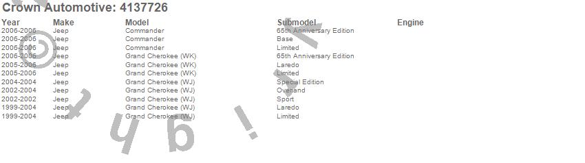 Crown Automotive is the premier manufacturer and distributor of quality replacement parts for Jeep® CJ™, Wrangler™, Cherokee™, Grand Cherokee™, Liberty™, and Commander™."From humble beginnings in 1963 in a small Boston storefront, Crown Automotive has consistently maintained its commitment to offering only quality parts and exceptional service. Today, with warehouses in Massachusetts, Georgia, Nevada, Spain, and the Czech Republic, totaling over 160,000 square feet, Crown Automotive continues to be the leader in quality replacement parts for Jeep® vehicles. With over 8,000 different parts in stock for Jeep® vehicles from 1942 on up, Crown has the largest stock of replacement parts for Jeep® vehicles, including factory-discontinued parts. In fact, many of the older Jeeps are still on (and off) the road thanks to Crown parts. The Crown line consists of axle, body, brake, clutch, cooling, driveline, electrical, engine, exhaust, fuel, steering, suspension, transmission and transfer case components. Crown Automotive also offers an exclusive line of component kits and accessory products. Because we know that Jeeps are driven harder than most other vehicles, we emphasize offering only quality parts. In fact, we test parts on Jeeps before distributing them to our dealers to insure that they meet our standards for quality. Crown also supports its entire line with a 12 month/12,000 mile warranty to insure our dealers and their customers of our commitment to offering quality parts. We know from experience that Jeep® owners would rather pay a little more for a good quality part that's backed by a strong guarantee. But we know that price is important as well. So, not only will you find Crown parts to be of exceptional quality, but you'll find them at a great price too.