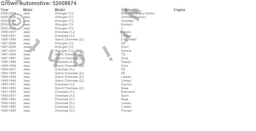 Crown Automotive is the premier manufacturer and distributor of quality replacement parts for Jeep® CJ™, Wrangler™, Cherokee™, Grand Cherokee™, Liberty™, and Commander™."From humble beginnings in 1963 in a small Boston storefront, Crown Automotive has consistently maintained its commitment to offering only quality parts and exceptional service. Today, with warehouses in Massachusetts, Georgia, Nevada, Spain, and the Czech Republic, totaling over 160,000 square feet, Crown Automotive continues to be the leader in quality replacement parts for Jeep® vehicles. With over 8,000 different parts in stock for Jeep® vehicles from 1942 on up, Crown has the largest stock of replacement parts for Jeep® vehicles, including factory-discontinued parts. In fact, many of the older Jeeps are still on (and off) the road thanks to Crown parts. The Crown line consists of axle, body, brake, clutch, cooling, driveline, electrical, engine, exhaust, fuel, steering, suspension, transmission and transfer case components. Crown Automotive also offers an exclusive line of component kits and accessory products. Because we know that Jeeps are driven harder than most other vehicles, we emphasize offering only quality parts. In fact, we test parts on Jeeps before distributing them to our dealers to insure that they meet our standards for quality. Crown also supports its entire line with a 12 month/12,000 mile warranty to insure our dealers and their customers of our commitment to offering quality parts. We know from experience that Jeep® owners would rather pay a little more for a good quality part that's backed by a strong guarantee. But we know that price is important as well. So, not only will you find Crown parts to be of exceptional quality, but you'll find them at a great price too.