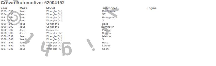 Crown Automotive is the premier manufacturer and distributor of quality replacement parts for Jeep® CJ™, Wrangler™, Cherokee™, Grand Cherokee™, Liberty™, and Commander™."From humble beginnings in 1963 in a small Boston storefront, Crown Automotive has consistently maintained its commitment to offering only quality parts and exceptional service. Today, with warehouses in Massachusetts, Georgia, Nevada, Spain, and the Czech Republic, totaling over 160,000 square feet, Crown Automotive continues to be the leader in quality replacement parts for Jeep® vehicles. With over 8,000 different parts in stock for Jeep® vehicles from 1942 on up, Crown has the largest stock of replacement parts for Jeep® vehicles, including factory-discontinued parts. In fact, many of the older Jeeps are still on (and off) the road thanks to Crown parts. The Crown line consists of axle, body, brake, clutch, cooling, driveline, electrical, engine, exhaust, fuel, steering, suspension, transmission and transfer case components. Crown Automotive also offers an exclusive line of component kits and accessory products. Because we know that Jeeps are driven harder than most other vehicles, we emphasize offering only quality parts. In fact, we test parts on Jeeps before distributing them to our dealers to insure that they meet our standards for quality. Crown also supports its entire line with a 12 month/12,000 mile warranty to insure our dealers and their customers of our commitment to offering quality parts. We know from experience that Jeep® owners would rather pay a little more for a good quality part that's backed by a strong guarantee. But we know that price is important as well. So, not only will you find Crown parts to be of exceptional quality, but you'll find them at a great price too.
