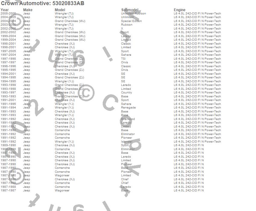 Cherokee (XJ), Comanche, Grand Cherokee (WJ), Grand Cherokee (ZJ), Wagoneer, Wrangler (LJ), Wrangler (TJ), Wrangler (YJ), Jeep, 2005, 2004, 2003, 2002, 2001, 2000, 1999, 1998, 1997, 1996, 1995 more…