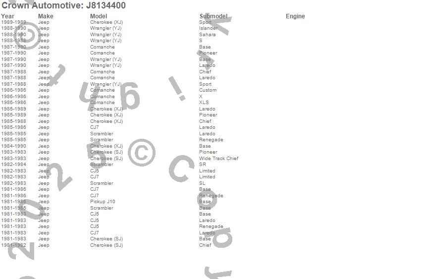 Cherokee (SJ), Cherokee (XJ), CJ5, CJ7, Comanche, J10, Scrambler, Wrangler (YJ), Jeep, 1990, 1989, 1988, 1987, 1986, 1985, 1984, 1983, 1982, 1981 more…