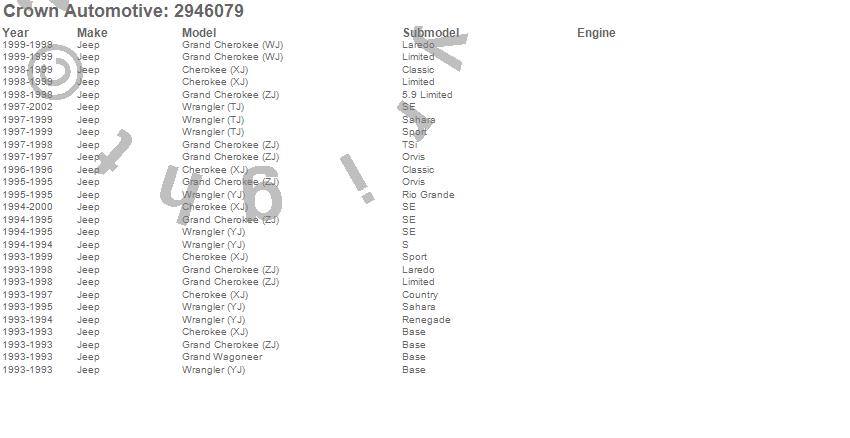 Cherokee (XJ), Grand Cherokee (WJ), Grand Cherokee (ZJ), Grand Wagoneer, Wrangler (TJ), Wrangler (YJ), Jeep, 2002, 2001, 2000, 1999, 1998, 1997, 1996, 1995, 1994, 1993 more…