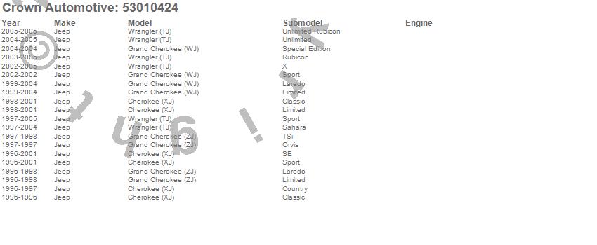 Crown Automotive is the premier manufacturer and distributor of quality replacement parts for Jeep® CJ™, Wrangler™, Cherokee™, Grand Cherokee™, Liberty™, and Commander™."From humble beginnings in 1963 in a small Boston storefront, Crown Automotive has consistently maintained its commitment to offering only quality parts and exceptional service. Today, with warehouses in Massachusetts, Georgia, Nevada, Spain, and the Czech Republic, totaling over 160,000 square feet, Crown Automotive continues to be the leader in quality replacement parts for Jeep® vehicles. With over 8,000 different parts in stock for Jeep® vehicles from 1942 on up, Crown has the largest stock of replacement parts for Jeep® vehicles, including factory-discontinued parts. In fact, many of the older Jeeps are still on (and off) the road thanks to Crown parts. The Crown line consists of axle, body, brake, clutch, cooling, driveline, electrical, engine, exhaust, fuel, steering, suspension, transmission and transfer case components. Crown Automotive also offers an exclusive line of component kits and accessory products. Because we know that Jeeps are driven harder than most other vehicles, we emphasize offering only quality parts. In fact, we test parts on Jeeps before distributing them to our dealers to insure that they meet our standards for quality. Crown also supports its entire line with a 12 month/12,000 mile warranty to insure our dealers and their customers of our commitment to offering quality parts. We know from experience that Jeep® owners would rather pay a little more for a good quality part that's backed by a strong guarantee. But we know that price is important as well. So, not only will you find Crown parts to be of exceptional quality, but you'll find them at a great price too.