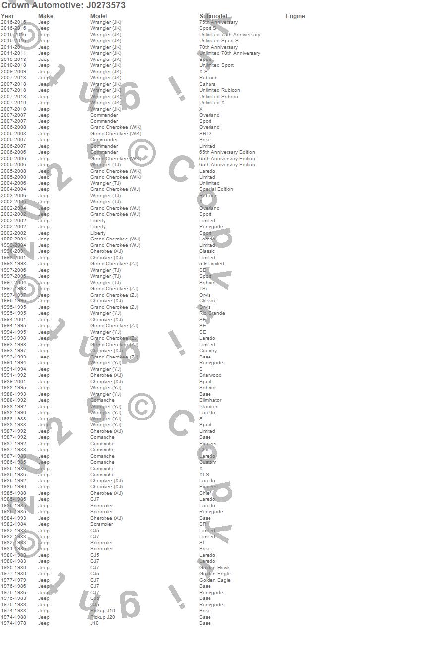 Crown Automotive is the premier manufacturer and distributor of quality replacement parts for Jeep® CJ™, Wrangler™, Cherokee™, Grand Cherokee™, Liberty™, and Commander™."From humble beginnings in 1963 in a small Boston storefront, Crown Automotive has consistently maintained its commitment to offering only quality parts and exceptional service. Today, with warehouses in Massachusetts, Georgia, Nevada, Spain, and the Czech Republic, totaling over 160,000 square feet, Crown Automotive continues to be the leader in quality replacement parts for Jeep® vehicles. With over 8,000 different parts in stock for Jeep® vehicles from 1942 on up, Crown has the largest stock of replacement parts for Jeep® vehicles, including factory-discontinued parts. In fact, many of the older Jeeps are still on (and off) the road thanks to Crown parts. The Crown line consists of axle, body, brake, clutch, cooling, driveline, electrical, engine, exhaust, fuel, steering, suspension, transmission and transfer case components. Crown Automotive also offers an exclusive line of component kits and accessory products. Because we know that Jeeps are driven harder than most other vehicles, we emphasize offering only quality parts. In fact, we test parts on Jeeps before distributing them to our dealers to insure that they meet our standards for quality. Crown also supports its entire line with a 12 month/12,000 mile warranty to insure our dealers and their customers of our commitment to offering quality parts. We know from experience that Jeep® owners would rather pay a little more for a good quality part that's backed by a strong guarantee. But we know that price is important as well. So, not only will you find Crown parts to be of exceptional quality, but you'll find them at a great price too.