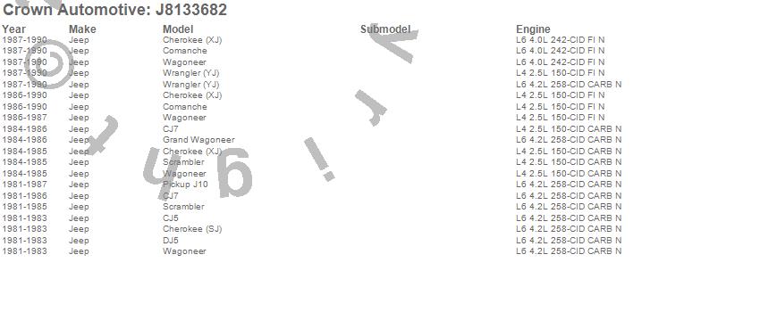 Cherokee (SJ), Cherokee (XJ), CJ5, CJ7, Comanche, DJ5, DJ5M, Grand Wagoneer, J10, Scrambler, Wagoneer, Wrangler (YJ), Jeep, 1990, 1989, 1988, 1987, 1986, 1985, 1984 more…