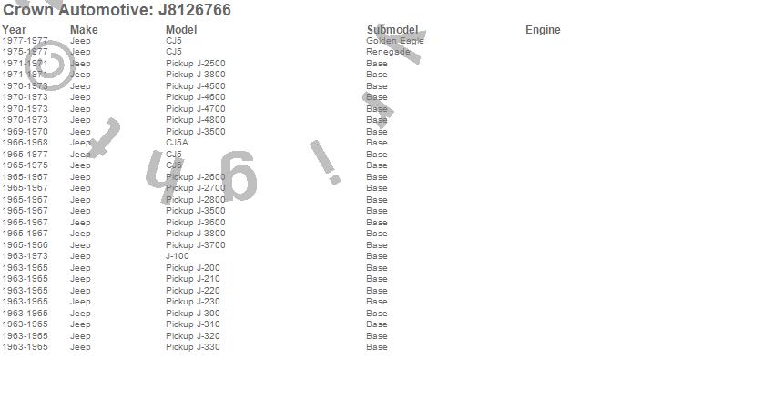 Crown Automotive is the premier manufacturer and distributor of quality replacement parts for Jeep® CJ™, Wrangler™, Cherokee™, Grand Cherokee™, Liberty™, and Commander™."From humble beginnings in 1963 in a small Boston storefront, Crown Automotive has consistently maintained its commitment to offering only quality parts and exceptional service. Today, with warehouses in Massachusetts, Georgia, Nevada, Spain, and the Czech Republic, totaling over 160,000 square feet, Crown Automotive continues to be the leader in quality replacement parts for Jeep® vehicles. With over 8,000 different parts in stock for Jeep® vehicles from 1942 on up, Crown has the largest stock of replacement parts for Jeep® vehicles, including factory-discontinued parts. In fact, many of the older Jeeps are still on (and off) the road thanks to Crown parts. The Crown line consists of axle, body, brake, clutch, cooling, driveline, electrical, engine, exhaust, fuel, steering, suspension, transmission and transfer case components. Crown Automotive also offers an exclusive line of component kits and accessory products. Because we know that Jeeps are driven harder than most other vehicles, we emphasize offering only quality parts. In fact, we test parts on Jeeps before distributing them to our dealers to insure that they meet our standards for quality. Crown also supports its entire line with a 12 month/12,000 mile warranty to insure our dealers and their customers of our commitment to offering quality parts. We know from experience that Jeep® owners would rather pay a little more for a good quality part that's backed by a strong guarantee. But we know that price is important as well. So, not only will you find Crown parts to be of exceptional quality, but you'll find them at a great price too.