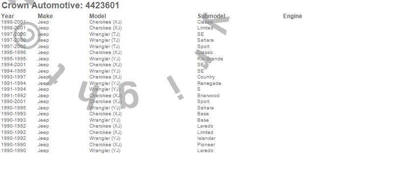 Crown Automotive is the premier manufacturer and distributor of quality replacement parts for Jeep® CJ™, Wrangler™, Cherokee™, Grand Cherokee™, Liberty™, and Commander™."From humble beginnings in 1963 in a small Boston storefront, Crown Automotive has consistently maintained its commitment to offering only quality parts and exceptional service. Today, with warehouses in Massachusetts, Georgia, Nevada, Spain, and the Czech Republic, totaling over 160,000 square feet, Crown Automotive continues to be the leader in quality replacement parts for Jeep® vehicles. With over 8,000 different parts in stock for Jeep® vehicles from 1942 on up, Crown has the largest stock of replacement parts for Jeep® vehicles, including factory-discontinued parts. In fact, many of the older Jeeps are still on (and off) the road thanks to Crown parts. The Crown line consists of axle, body, brake, clutch, cooling, driveline, electrical, engine, exhaust, fuel, steering, suspension, transmission and transfer case components. Crown Automotive also offers an exclusive line of component kits and accessory products. Because we know that Jeeps are driven harder than most other vehicles, we emphasize offering only quality parts. In fact, we test parts on Jeeps before distributing them to our dealers to insure that they meet our standards for quality. Crown also supports its entire line with a 12 month/12,000 mile warranty to insure our dealers and their customers of our commitment to offering quality parts. We know from experience that Jeep® owners would rather pay a little more for a good quality part that's backed by a strong guarantee. But we know that price is important as well. So, not only will you find Crown parts to be of exceptional quality, but you'll find them at a great price too.