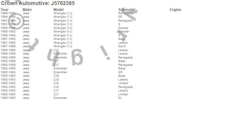 Crown Automotive is the premier manufacturer and distributor of quality replacement parts for Jeep® CJ™, Wrangler™, Cherokee™, Grand Cherokee™, Liberty™, and Commander™."From humble beginnings in 1963 in a small Boston storefront, Crown Automotive has consistently maintained its commitment to offering only quality parts and exceptional service. Today, with warehouses in Massachusetts, Georgia, Nevada, Spain, and the Czech Republic, totaling over 160,000 square feet, Crown Automotive continues to be the leader in quality replacement parts for Jeep® vehicles. With over 8,000 different parts in stock for Jeep® vehicles from 1942 on up, Crown has the largest stock of replacement parts for Jeep® vehicles, including factory-discontinued parts. In fact, many of the older Jeeps are still on (and off) the road thanks to Crown parts. The Crown line consists of axle, body, brake, clutch, cooling, driveline, electrical, engine, exhaust, fuel, steering, suspension, transmission and transfer case components. Crown Automotive also offers an exclusive line of component kits and accessory products. Because we know that Jeeps are driven harder than most other vehicles, we emphasize offering only quality parts. In fact, we test parts on Jeeps before distributing them to our dealers to insure that they meet our standards for quality. Crown also supports its entire line with a 12 month/12,000 mile warranty to insure our dealers and their customers of our commitment to offering quality parts. We know from experience that Jeep® owners would rather pay a little more for a good quality part that's backed by a strong guarantee. But we know that price is important as well. So, not only will you find Crown parts to be of exceptional quality, but you'll find them at a great price too.