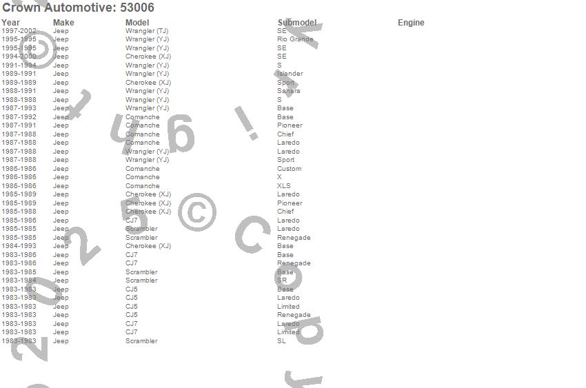 Crown Automotive is the premier manufacturer and distributor of quality replacement parts for Jeep® CJ™, Wrangler™, Cherokee™, Grand Cherokee™, Liberty™, and Commander™."From humble beginnings in 1963 in a small Boston storefront, Crown Automotive has consistently maintained its commitment to offering only quality parts and exceptional service. Today, with warehouses in Massachusetts, Georgia, Nevada, Spain, and the Czech Republic, totaling over 160,000 square feet, Crown Automotive continues to be the leader in quality replacement parts for Jeep® vehicles. With over 8,000 different parts in stock for Jeep® vehicles from 1942 on up, Crown has the largest stock of replacement parts for Jeep® vehicles, including factory-discontinued parts. In fact, many of the older Jeeps are still on (and off) the road thanks to Crown parts. The Crown line consists of axle, body, brake, clutch, cooling, driveline, electrical, engine, exhaust, fuel, steering, suspension, transmission and transfer case components. Crown Automotive also offers an exclusive line of component kits and accessory products. Because we know that Jeeps are driven harder than most other vehicles, we emphasize offering only quality parts. In fact, we test parts on Jeeps before distributing them to our dealers to insure that they meet our standards for quality. Crown also supports its entire line with a 12 month/12,000 mile warranty to insure our dealers and their customers of our commitment to offering quality parts. We know from experience that Jeep® owners would rather pay a little more for a good quality part that's backed by a strong guarantee. But we know that price is important as well. So, not only will you find Crown parts to be of exceptional quality, but you'll find them at a great price too.