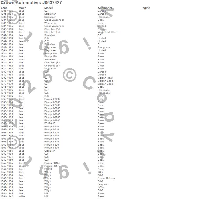 1-Ton Pickup, Cherokee (SJ), CJ-2A, CJ-3A, CJ-3B, CJ3, CJ5, CJ6, CJ7, FC150, FC170, FC170HD, Gladiator, Grand Wagoneer, J-200, J-210, J-220, J-230, J-2500, J-2600 more…