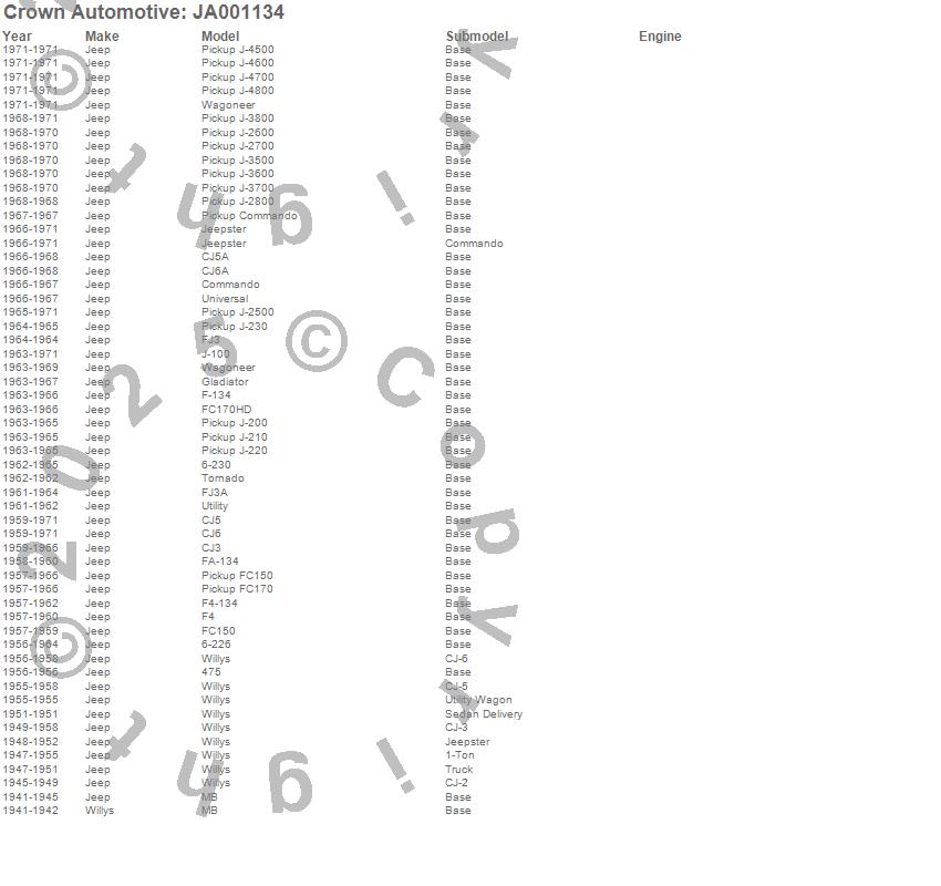 1-Ton Pickup, 475, 6-226, 6-230, CJ-2A, CJ-3A, CJ-3B, CJ3, CJ5, CJ5A, CJ6, CJ6A, Commando, F-134, F4, F4-134, FA-134, FC150, FC170, FC170HD more…