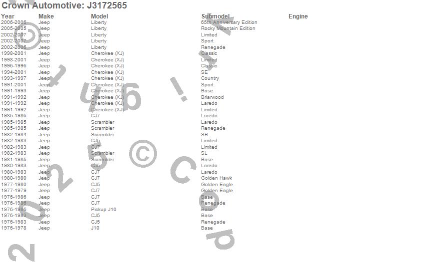 Crown Automotive is the premier manufacturer and distributor of quality replacement parts for Jeep® CJ™, Wrangler™, Cherokee™, Grand Cherokee™, Liberty™, and Commander™."From humble beginnings in 1963 in a small Boston storefront, Crown Automotive has consistently maintained its commitment to offering only quality parts and exceptional service. Today, with warehouses in Massachusetts, Georgia, Nevada, Spain, and the Czech Republic, totaling over 160,000 square feet, Crown Automotive continues to be the leader in quality replacement parts for Jeep® vehicles. With over 8,000 different parts in stock for Jeep® vehicles from 1942 on up, Crown has the largest stock of replacement parts for Jeep® vehicles, including factory-discontinued parts. In fact, many of the older Jeeps are still on (and off) the road thanks to Crown parts. The Crown line consists of axle, body, brake, clutch, cooling, driveline, electrical, engine, exhaust, fuel, steering, suspension, transmission and transfer case components. Crown Automotive also offers an exclusive line of component kits and accessory products. Because we know that Jeeps are driven harder than most other vehicles, we emphasize offering only quality parts. In fact, we test parts on Jeeps before distributing them to our dealers to insure that they meet our standards for quality. Crown also supports its entire line with a 12 month/12,000 mile warranty to insure our dealers and their customers of our commitment to offering quality parts. We know from experience that Jeep® owners would rather pay a little more for a good quality part that's backed by a strong guarantee. But we know that price is important as well. So, not only will you find Crown parts to be of exceptional quality, but you'll find them at a great price too.