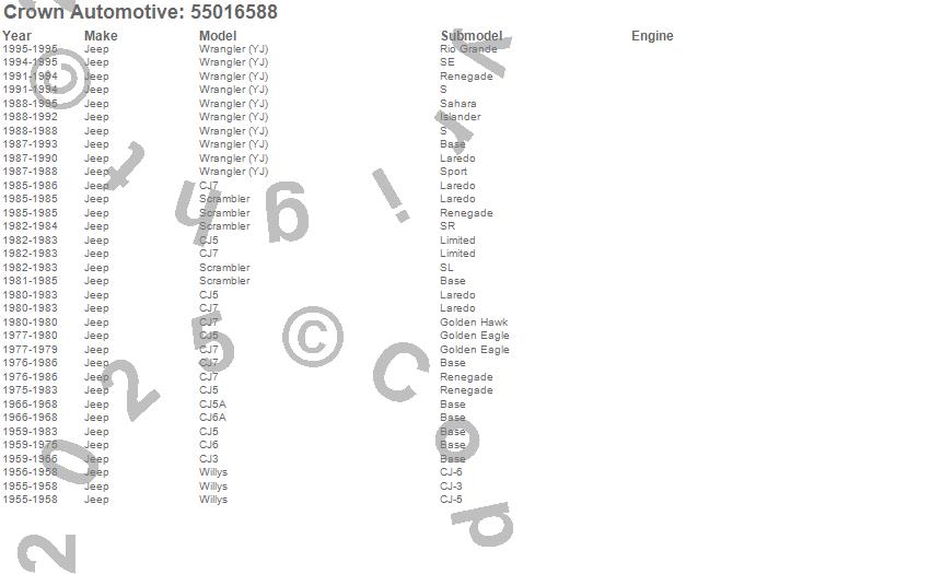 Crown Automotive is the premier manufacturer and distributor of quality replacement parts for Jeep® CJ™, Wrangler™, Cherokee™, Grand Cherokee™, Liberty™, and Commander™."From humble beginnings in 1963 in a small Boston storefront, Crown Automotive has consistently maintained its commitment to offering only quality parts and exceptional service. Today, with warehouses in Massachusetts, Georgia, Nevada, Spain, and the Czech Republic, totaling over 160,000 square feet, Crown Automotive continues to be the leader in quality replacement parts for Jeep® vehicles. With over 8,000 different parts in stock for Jeep® vehicles from 1942 on up, Crown has the largest stock of replacement parts for Jeep® vehicles, including factory-discontinued parts. In fact, many of the older Jeeps are still on (and off) the road thanks to Crown parts. The Crown line consists of axle, body, brake, clutch, cooling, driveline, electrical, engine, exhaust, fuel, steering, suspension, transmission and transfer case components. Crown Automotive also offers an exclusive line of component kits and accessory products. Because we know that Jeeps are driven harder than most other vehicles, we emphasize offering only quality parts. In fact, we test parts on Jeeps before distributing them to our dealers to insure that they meet our standards for quality. Crown also supports its entire line with a 12 month/12,000 mile warranty to insure our dealers and their customers of our commitment to offering quality parts. We know from experience that Jeep® owners would rather pay a little more for a good quality part that's backed by a strong guarantee. But we know that price is important as well. So, not only will you find Crown parts to be of exceptional quality, but you'll find them at a great price too.