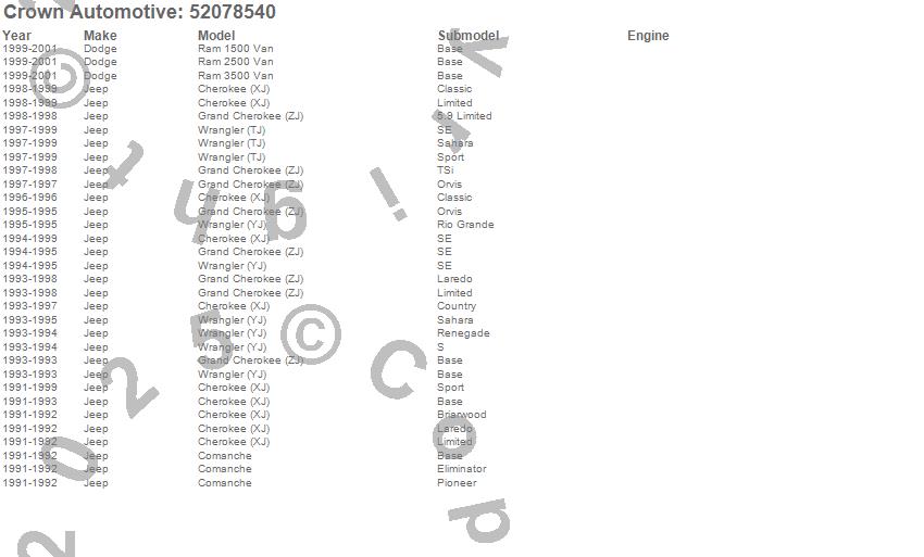 Cherokee (XJ), Comanche, Grand Cherokee (ZJ), Ram 1500 Van, Ram 2500 Van, Ram 3500 Van, Wrangler (TJ), Wrangler (YJ), Dodge, Jeep, 2001, 2000, 1999, 1998, 1997, 1996, 1995, 1994, 1993, 1992 more…