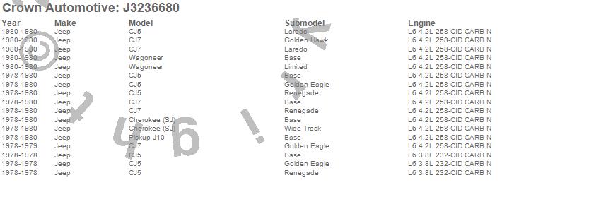 Crown Automotive is the premier manufacturer and distributor of quality replacement parts for Jeep® CJ™, Wrangler™, Cherokee™, Grand Cherokee™, Liberty™, and Commander™."From humble beginnings in 1963 in a small Boston storefront, Crown Automotive has consistently maintained its commitment to offering only quality parts and exceptional service. Today, with warehouses in Massachusetts, Georgia, Nevada, Spain, and the Czech Republic, totaling over 160,000 square feet, Crown Automotive continues to be the leader in quality replacement parts for Jeep® vehicles. With over 8,000 different parts in stock for Jeep® vehicles from 1942 on up, Crown has the largest stock of replacement parts for Jeep® vehicles, including factory-discontinued parts. In fact, many of the older Jeeps are still on (and off) the road thanks to Crown parts. The Crown line consists of axle, body, brake, clutch, cooling, driveline, electrical, engine, exhaust, fuel, steering, suspension, transmission and transfer case components. Crown Automotive also offers an exclusive line of component kits and accessory products. Because we know that Jeeps are driven harder than most other vehicles, we emphasize offering only quality parts. In fact, we test parts on Jeeps before distributing them to our dealers to insure that they meet our standards for quality. Crown also supports its entire line with a 12 month/12,000 mile warranty to insure our dealers and their customers of our commitment to offering quality parts. We know from experience that Jeep® owners would rather pay a little more for a good quality part that's backed by a strong guarantee. But we know that price is important as well. So, not only will you find Crown parts to be of exceptional quality, but you'll find them at a great price too.