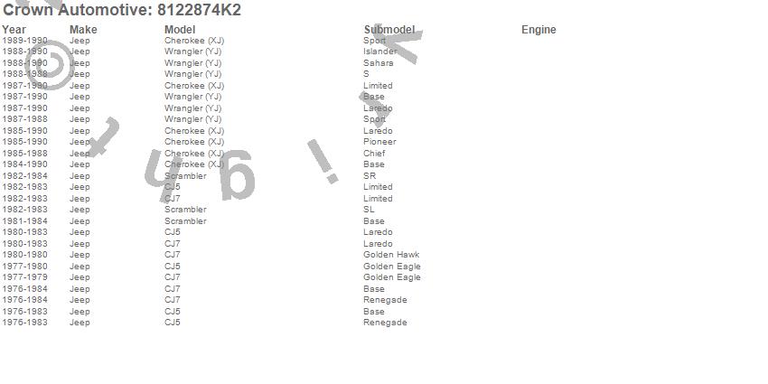 Cherokee (XJ), CJ5, CJ7, Scrambler, Wrangler (YJ), Jeep, 1990, 1989, 1988, 1987, 1986, 1985, 1984, 1983, 1982, 1981, 1980, 1979, 1978, 1977 more…