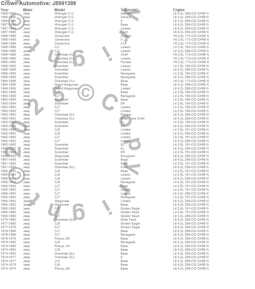 Cherokee (SJ), Cherokee (XJ), CJ5, CJ6, CJ7, Comanche, Grand Wagoneer, J10, J20, Scrambler, Wagoneer, Wrangler (YJ), Jeep, 1990, 1989, 1988, 1987, 1986, 1985, 1984 more…