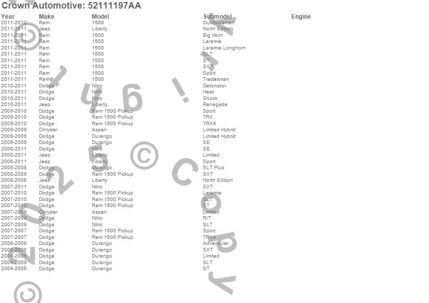 1500, Aspen, Durango, Liberty, Nitro, Ram 1500, Chrysler, Dodge, Jeep, Ram, 2011, 2010, 2009, 2008, 2007, 2006, 2005, 2004 more…