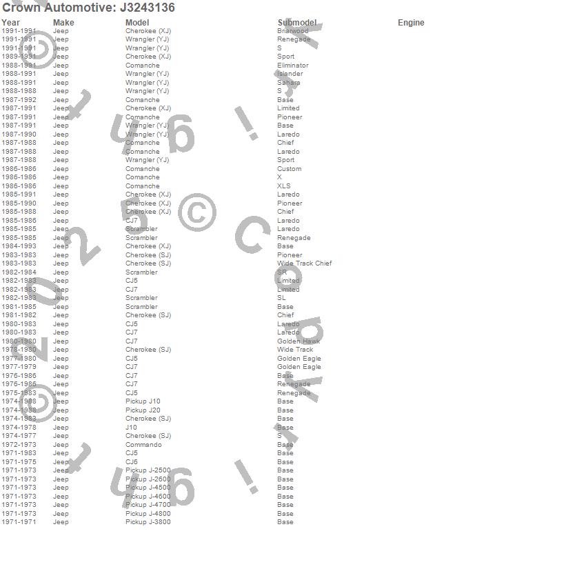 Cherokee (SJ), Cherokee (XJ), CJ5, CJ6, CJ7, Comanche, Commando, J-2500, J-2600, J-3800, J-4500, J-4600, J-4700, J-4800, J10, J20, Scrambler, Wrangler (YJ), Jeep, 1993 more…