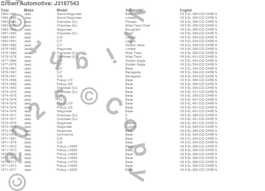 Crown Automotive is the premier manufacturer and distributor of quality replacement parts for Jeep® CJ™, Wrangler™, Cherokee™, Grand Cherokee™, Liberty™, and Commander™."From humble beginnings in 1963 in a small Boston storefront, Crown Automotive has consistently maintained its commitment to offering only quality parts and exceptional service. Today, with warehouses in Massachusetts, Georgia, Nevada, Spain, and the Czech Republic, totaling over 160,000 square feet, Crown Automotive continues to be the leader in quality replacement parts for Jeep® vehicles. With over 8,000 different parts in stock for Jeep® vehicles from 1942 on up, Crown has the largest stock of replacement parts for Jeep® vehicles, including factory-discontinued parts. In fact, many of the older Jeeps are still on (and off) the road thanks to Crown parts. The Crown line consists of axle, body, brake, clutch, cooling, driveline, electrical, engine, exhaust, fuel, steering, suspension, transmission and transfer case components. Crown Automotive also offers an exclusive line of component kits and accessory products. Because we know that Jeeps are driven harder than most other vehicles, we emphasize offering only quality parts. In fact, we test parts on Jeeps before distributing them to our dealers to insure that they meet our standards for quality. Crown also supports its entire line with a 12 month/12,000 mile warranty to insure our dealers and their customers of our commitment to offering quality parts. We know from experience that Jeep® owners would rather pay a little more for a good quality part that's backed by a strong guarantee. But we know that price is important as well. So, not only will you find Crown parts to be of exceptional quality, but you'll find them at a great price too.