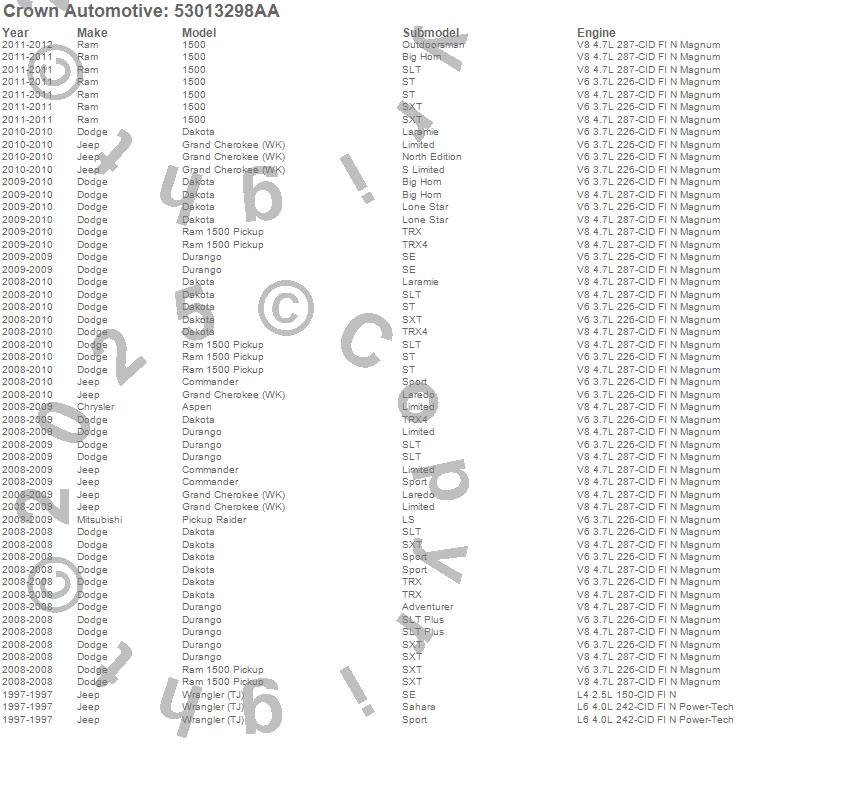 1500, Aspen, Commander, Dakota, Durango, Grand Cherokee (WK), Raider, Ram 1500, Wrangler (TJ), Chrysler, Dodge, Jeep, Mitsubishi, Ram, 2011, 2010, 2009, 2008, 1997 more…