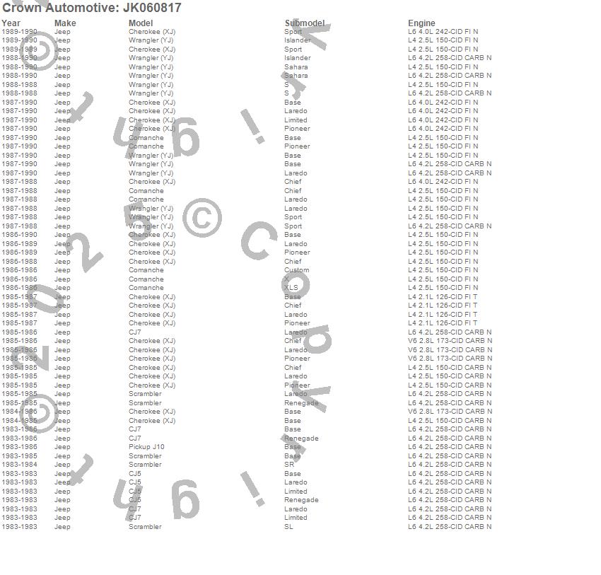 Crown Automotive is the premier manufacturer and distributor of quality replacement parts for Jeep® CJ™, Wrangler™, Cherokee™, Grand Cherokee™, Liberty™, and Commander™."From humble beginnings in 1963 in a small Boston storefront, Crown Automotive has consistently maintained its commitment to offering only quality parts and exceptional service. Today, with warehouses in Massachusetts, Georgia, Nevada, Spain, and the Czech Republic, totaling over 160,000 square feet, Crown Automotive continues to be the leader in quality replacement parts for Jeep® vehicles. With over 8,000 different parts in stock for Jeep® vehicles from 1942 on up, Crown has the largest stock of replacement parts for Jeep® vehicles, including factory-discontinued parts. In fact, many of the older Jeeps are still on (and off) the road thanks to Crown parts. The Crown line consists of axle, body, brake, clutch, cooling, driveline, electrical, engine, exhaust, fuel, steering, suspension, transmission and transfer case components. Crown Automotive also offers an exclusive line of component kits and accessory products. Because we know that Jeeps are driven harder than most other vehicles, we emphasize offering only quality parts. In fact, we test parts on Jeeps before distributing them to our dealers to insure that they meet our standards for quality. Crown also supports its entire line with a 12 month/12,000 mile warranty to insure our dealers and their customers of our commitment to offering quality parts. We know from experience that Jeep® owners would rather pay a little more for a good quality part that's backed by a strong guarantee. But we know that price is important as well. So, not only will you find Crown parts to be of exceptional quality, but you'll find them at a great price too.