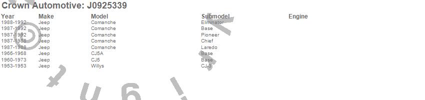 Crown Automotive is the premier manufacturer and distributor of quality replacement parts for Jeep® CJ™, Wrangler™, Cherokee™, Grand Cherokee™, Liberty™, and Commander™."From humble beginnings in 1963 in a small Boston storefront, Crown Automotive has consistently maintained its commitment to offering only quality parts and exceptional service. Today, with warehouses in Massachusetts, Georgia, Nevada, Spain, and the Czech Republic, totaling over 160,000 square feet, Crown Automotive continues to be the leader in quality replacement parts for Jeep® vehicles. With over 8,000 different parts in stock for Jeep® vehicles from 1942 on up, Crown has the largest stock of replacement parts for Jeep® vehicles, including factory-discontinued parts. In fact, many of the older Jeeps are still on (and off) the road thanks to Crown parts. The Crown line consists of axle, body, brake, clutch, cooling, driveline, electrical, engine, exhaust, fuel, steering, suspension, transmission and transfer case components. Crown Automotive also offers an exclusive line of component kits and accessory products. Because we know that Jeeps are driven harder than most other vehicles, we emphasize offering only quality parts. In fact, we test parts on Jeeps before distributing them to our dealers to insure that they meet our standards for quality. Crown also supports its entire line with a 12 month/12,000 mile warranty to insure our dealers and their customers of our commitment to offering quality parts. We know from experience that Jeep® owners would rather pay a little more for a good quality part that's backed by a strong guarantee. But we know that price is important as well. So, not only will you find Crown parts to be of exceptional quality, but you'll find them at a great price too.