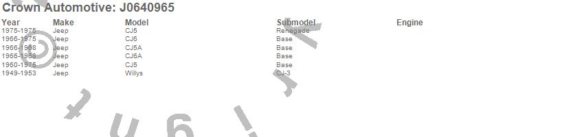 Crown Automotive is the premier manufacturer and distributor of quality replacement parts for Jeep® CJ™, Wrangler™, Cherokee™, Grand Cherokee™, Liberty™, and Commander™."From humble beginnings in 1963 in a small Boston storefront, Crown Automotive has consistently maintained its commitment to offering only quality parts and exceptional service. Today, with warehouses in Massachusetts, Georgia, Nevada, Spain, and the Czech Republic, totaling over 160,000 square feet, Crown Automotive continues to be the leader in quality replacement parts for Jeep® vehicles. With over 8,000 different parts in stock for Jeep® vehicles from 1942 on up, Crown has the largest stock of replacement parts for Jeep® vehicles, including factory-discontinued parts. In fact, many of the older Jeeps are still on (and off) the road thanks to Crown parts. The Crown line consists of axle, body, brake, clutch, cooling, driveline, electrical, engine, exhaust, fuel, steering, suspension, transmission and transfer case components. Crown Automotive also offers an exclusive line of component kits and accessory products. Because we know that Jeeps are driven harder than most other vehicles, we emphasize offering only quality parts. In fact, we test parts on Jeeps before distributing them to our dealers to insure that they meet our standards for quality. Crown also supports its entire line with a 12 month/12,000 mile warranty to insure our dealers and their customers of our commitment to offering quality parts. We know from experience that Jeep® owners would rather pay a little more for a good quality part that's backed by a strong guarantee. But we know that price is important as well. So, not only will you find Crown parts to be of exceptional quality, but you'll find them at a great price too.