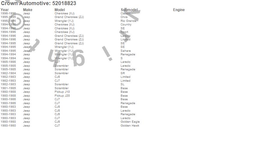 Cherokee (XJ), CJ5, CJ7, Grand Cherokee (ZJ), J10, J20, Scrambler, Wrangler (YJ), Jeep, 1996, 1995, 1994, 1988, 1987, 1986, 1985, 1984, 1983, 1982, 1981 more…
