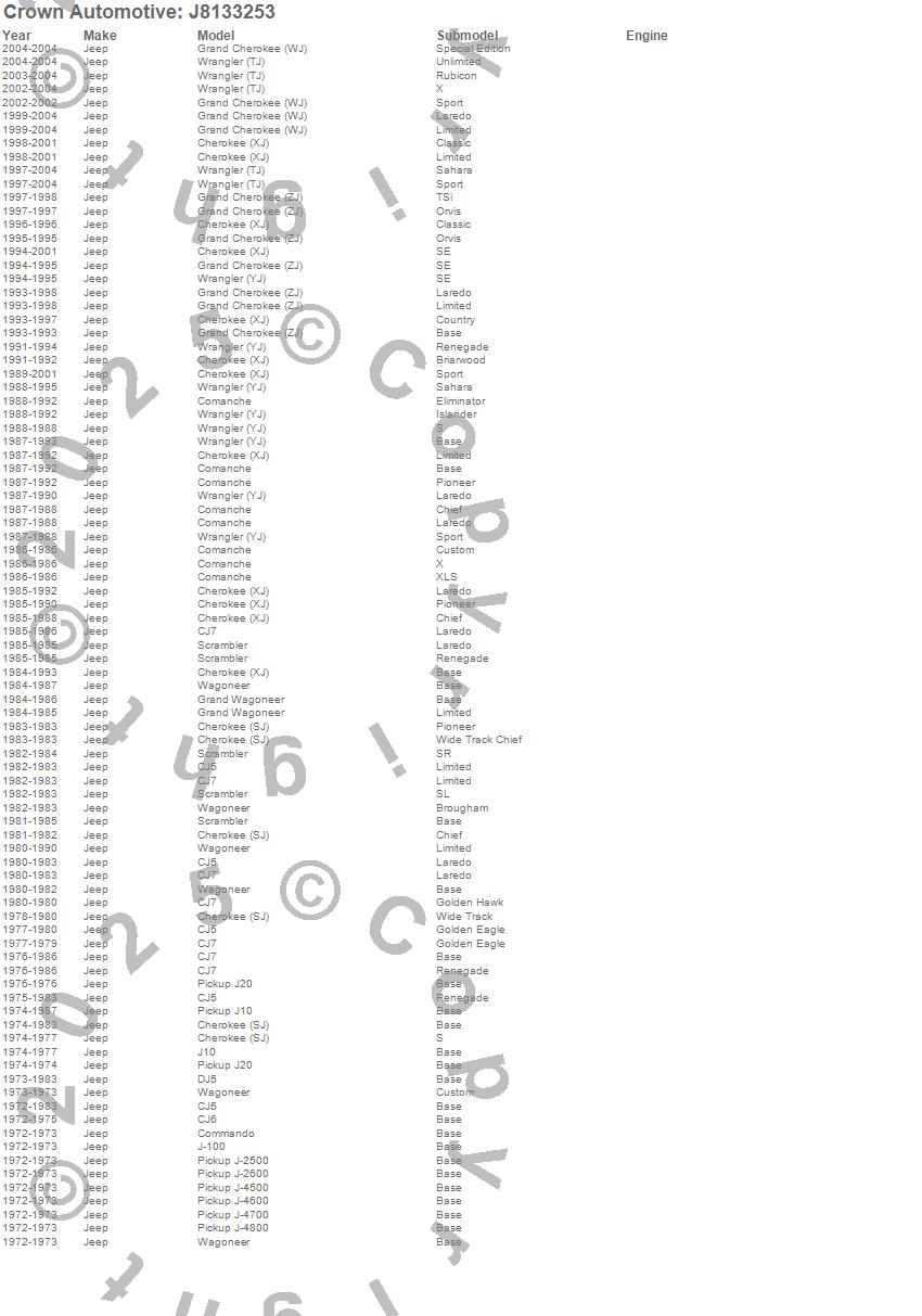 Cherokee (SJ), Cherokee (XJ), CJ5, CJ6, CJ7, Comanche, Commando, DJ5, DJ5C, DJ5F, DJ5M, Grand Cherokee (WJ), Grand Cherokee (ZJ), Grand Wagoneer, J-100, J-2500, J-2600, J-4500, J-4600, J-4700 more…