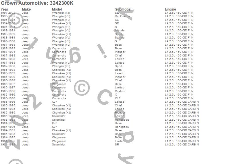 Crown Automotive is the premier manufacturer and distributor of quality replacement parts for Jeep® CJ™, Wrangler™, Cherokee™, Grand Cherokee™, Liberty™, and Commander™."From humble beginnings in 1963 in a small Boston storefront, Crown Automotive has consistently maintained its commitment to offering only quality parts and exceptional service. Today, with warehouses in Massachusetts, Georgia, Nevada, Spain, and the Czech Republic, totaling over 160,000 square feet, Crown Automotive continues to be the leader in quality replacement parts for Jeep® vehicles. With over 8,000 different parts in stock for Jeep® vehicles from 1942 on up, Crown has the largest stock of replacement parts for Jeep® vehicles, including factory-discontinued parts. In fact, many of the older Jeeps are still on (and off) the road thanks to Crown parts. The Crown line consists of axle, body, brake, clutch, cooling, driveline, electrical, engine, exhaust, fuel, steering, suspension, transmission and transfer case components. Crown Automotive also offers an exclusive line of component kits and accessory products. Because we know that Jeeps are driven harder than most other vehicles, we emphasize offering only quality parts. In fact, we test parts on Jeeps before distributing them to our dealers to insure that they meet our standards for quality. Crown also supports its entire line with a 12 month/12,000 mile warranty to insure our dealers and their customers of our commitment to offering quality parts. We know from experience that Jeep® owners would rather pay a little more for a good quality part that's backed by a strong guarantee. But we know that price is important as well. So, not only will you find Crown parts to be of exceptional quality, but you'll find them at a great price too.