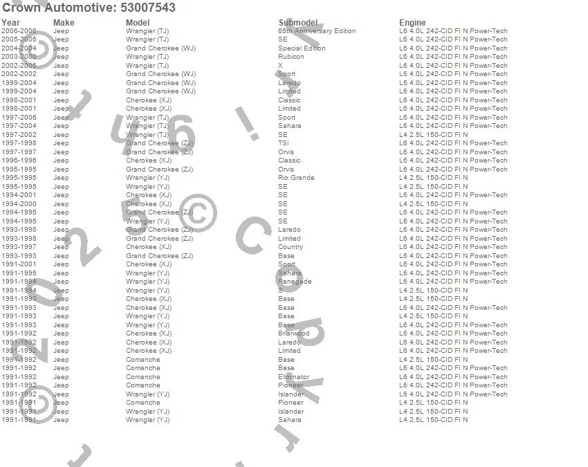 Cherokee (XJ), Comanche, Grand Cherokee (WJ), Grand Cherokee (ZJ), Wrangler (TJ), Wrangler (YJ), Jeep, 2006, 2005, 2004, 2003, 2002, 2001, 2000, 1999, 1998, 1997, 1996, 1995, 1994 more…