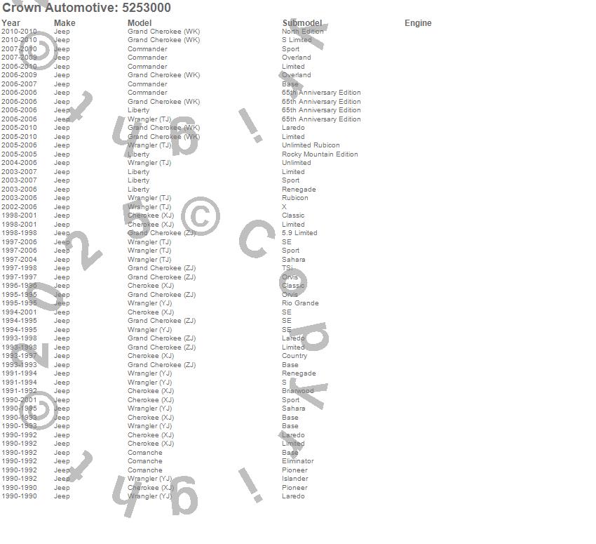 Crown Automotive is the premier manufacturer and distributor of quality replacement parts for Jeep® CJ™, Wrangler™, Cherokee™, Grand Cherokee™, Liberty™, and Commander™."From humble beginnings in 1963 in a small Boston storefront, Crown Automotive has consistently maintained its commitment to offering only quality parts and exceptional service. Today, with warehouses in Massachusetts, Georgia, Nevada, Spain, and the Czech Republic, totaling over 160,000 square feet, Crown Automotive continues to be the leader in quality replacement parts for Jeep® vehicles. With over 8,000 different parts in stock for Jeep® vehicles from 1942 on up, Crown has the largest stock of replacement parts for Jeep® vehicles, including factory-discontinued parts. In fact, many of the older Jeeps are still on (and off) the road thanks to Crown parts. The Crown line consists of axle, body, brake, clutch, cooling, driveline, electrical, engine, exhaust, fuel, steering, suspension, transmission and transfer case components. Crown Automotive also offers an exclusive line of component kits and accessory products. Because we know that Jeeps are driven harder than most other vehicles, we emphasize offering only quality parts. In fact, we test parts on Jeeps before distributing them to our dealers to insure that they meet our standards for quality. Crown also supports its entire line with a 12 month/12,000 mile warranty to insure our dealers and their customers of our commitment to offering quality parts. We know from experience that Jeep® owners would rather pay a little more for a good quality part that's backed by a strong guarantee. But we know that price is important as well. So, not only will you find Crown parts to be of exceptional quality, but you'll find them at a great price too.