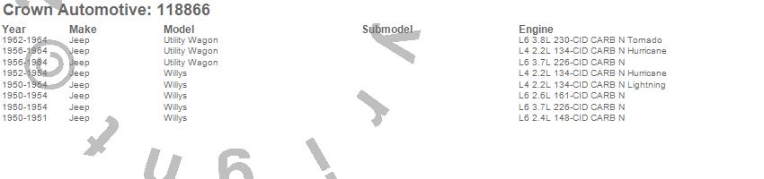 Crown Automotive is the premier manufacturer and distributor of quality replacement parts for Jeep® CJ™, Wrangler™, Cherokee™, Grand Cherokee™, Liberty™, and Commander™."From humble beginnings in 1963 in a small Boston storefront, Crown Automotive has consistently maintained its commitment to offering only quality parts and exceptional service. Today, with warehouses in Massachusetts, Georgia, Nevada, Spain, and the Czech Republic, totaling over 160,000 square feet, Crown Automotive continues to be the leader in quality replacement parts for Jeep® vehicles. With over 8,000 different parts in stock for Jeep® vehicles from 1942 on up, Crown has the largest stock of replacement parts for Jeep® vehicles, including factory-discontinued parts. In fact, many of the older Jeeps are still on (and off) the road thanks to Crown parts. The Crown line consists of axle, body, brake, clutch, cooling, driveline, electrical, engine, exhaust, fuel, steering, suspension, transmission and transfer case components. Crown Automotive also offers an exclusive line of component kits and accessory products. Because we know that Jeeps are driven harder than most other vehicles, we emphasize offering only quality parts. In fact, we test parts on Jeeps before distributing them to our dealers to insure that they meet our standards for quality. Crown also supports its entire line with a 12 month/12,000 mile warranty to insure our dealers and their customers of our commitment to offering quality parts. We know from experience that Jeep® owners would rather pay a little more for a good quality part that's backed by a strong guarantee. But we know that price is important as well. So, not only will you find Crown parts to be of exceptional quality, but you'll find them at a great price too.