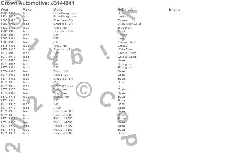 Cherokee (SJ), CJ5, CJ6, CJ7, Commando, DJ5, DJ5C, Grand Wagoneer, J-100, J-2500, J-2600, J-3800, J-4500, J-4600, J-4700, J-4800, J10, J20, Jeepster, Wagoneer more…