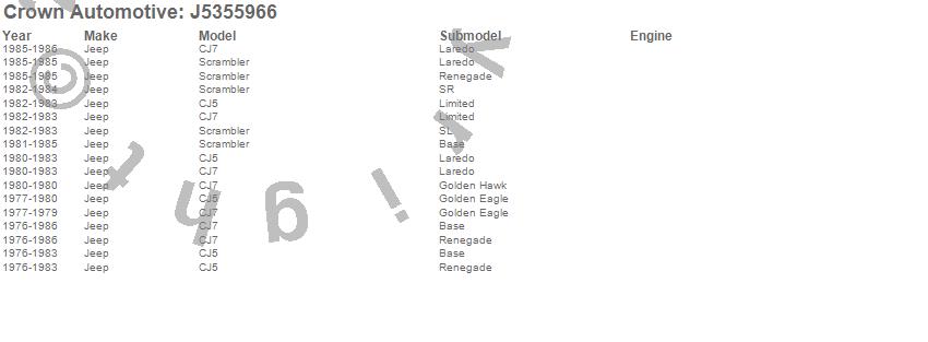 Crown Automotive is the premier manufacturer and distributor of quality replacement parts for Jeep® CJ™, Wrangler™, Cherokee™, Grand Cherokee™, Liberty™, and Commander™."From humble beginnings in 1963 in a small Boston storefront, Crown Automotive has consistently maintained its commitment to offering only quality parts and exceptional service. Today, with warehouses in Massachusetts, Georgia, Nevada, Spain, and the Czech Republic, totaling over 160,000 square feet, Crown Automotive continues to be the leader in quality replacement parts for Jeep® vehicles. With over 8,000 different parts in stock for Jeep® vehicles from 1942 on up, Crown has the largest stock of replacement parts for Jeep® vehicles, including factory-discontinued parts. In fact, many of the older Jeeps are still on (and off) the road thanks to Crown parts. The Crown line consists of axle, body, brake, clutch, cooling, driveline, electrical, engine, exhaust, fuel, steering, suspension, transmission and transfer case components. Crown Automotive also offers an exclusive line of component kits and accessory products. Because we know that Jeeps are driven harder than most other vehicles, we emphasize offering only quality parts. In fact, we test parts on Jeeps before distributing them to our dealers to insure that they meet our standards for quality. Crown also supports its entire line with a 12 month/12,000 mile warranty to insure our dealers and their customers of our commitment to offering quality parts. We know from experience that Jeep® owners would rather pay a little more for a good quality part that's backed by a strong guarantee. But we know that price is important as well. So, not only will you find Crown parts to be of exceptional quality, but you'll find them at a great price too.