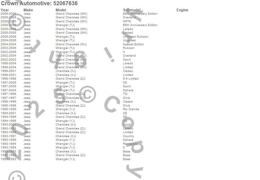 Cherokee (XJ), Grand Cherokee (WJ), Grand Cherokee (WK), Grand Cherokee (ZJ), Wrangler (LJ), Wrangler (TJ), Wrangler (YJ), Jeep, 2006, 2005, 2004, 2003, 2002, 2001, 2000, 1999, 1998, 1997, 1996, 1995 more…
