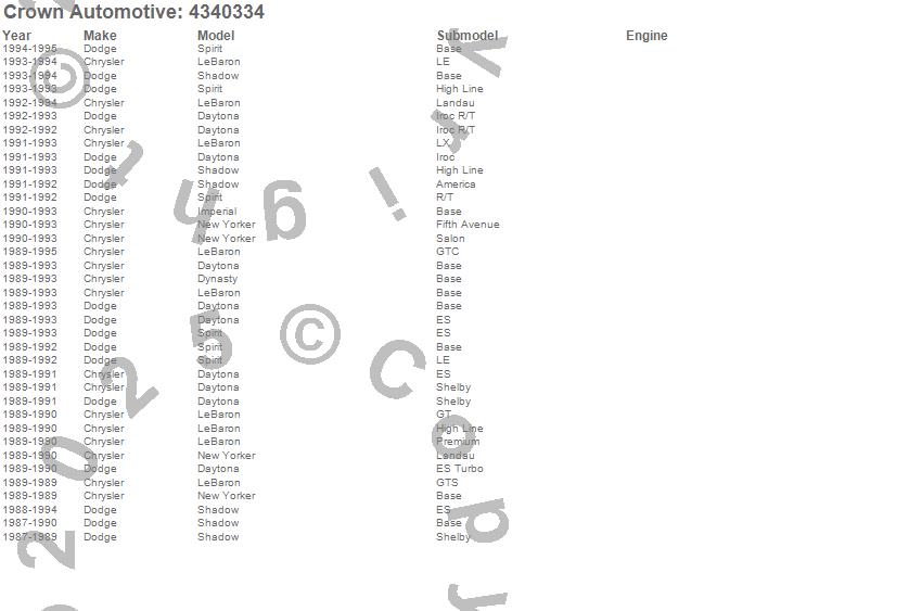Daytona, Dynasty, Imperial, LeBaron, New Yorker, Shadow, Spirit, Chrysler, Dodge, 1995, 1994, 1993, 1992, 1991, 1990, 1989, 1988, 1987 more…