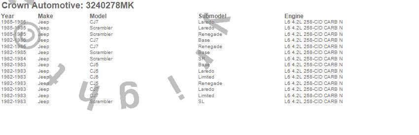 Crown Automotive is the premier manufacturer and distributor of quality replacement parts for Jeep® CJ™, Wrangler™, Cherokee™, Grand Cherokee™, Liberty™, and Commander™."From humble beginnings in 1963 in a small Boston storefront, Crown Automotive has consistently maintained its commitment to offering only quality parts and exceptional service. Today, with warehouses in Massachusetts, Georgia, Nevada, Spain, and the Czech Republic, totaling over 160,000 square feet, Crown Automotive continues to be the leader in quality replacement parts for Jeep® vehicles. With over 8,000 different parts in stock for Jeep® vehicles from 1942 on up, Crown has the largest stock of replacement parts for Jeep® vehicles, including factory-discontinued parts. In fact, many of the older Jeeps are still on (and off) the road thanks to Crown parts. The Crown line consists of axle, body, brake, clutch, cooling, driveline, electrical, engine, exhaust, fuel, steering, suspension, transmission and transfer case components. Crown Automotive also offers an exclusive line of component kits and accessory products. Because we know that Jeeps are driven harder than most other vehicles, we emphasize offering only quality parts. In fact, we test parts on Jeeps before distributing them to our dealers to insure that they meet our standards for quality. Crown also supports its entire line with a 12 month/12,000 mile warranty to insure our dealers and their customers of our commitment to offering quality parts. We know from experience that Jeep® owners would rather pay a little more for a good quality part that's backed by a strong guarantee. But we know that price is important as well. So, not only will you find Crown parts to be of exceptional quality, but you'll find them at a great price too.
