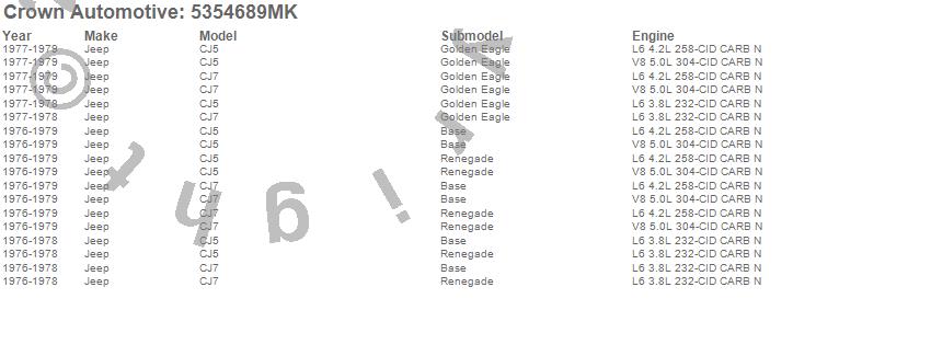 Crown Automotive is the premier manufacturer and distributor of quality replacement parts for Jeep® CJ™, Wrangler™, Cherokee™, Grand Cherokee™, Liberty™, and Commander™."From humble beginnings in 1963 in a small Boston storefront, Crown Automotive has consistently maintained its commitment to offering only quality parts and exceptional service. Today, with warehouses in Massachusetts, Georgia, Nevada, Spain, and the Czech Republic, totaling over 160,000 square feet, Crown Automotive continues to be the leader in quality replacement parts for Jeep® vehicles. With over 8,000 different parts in stock for Jeep® vehicles from 1942 on up, Crown has the largest stock of replacement parts for Jeep® vehicles, including factory-discontinued parts. In fact, many of the older Jeeps are still on (and off) the road thanks to Crown parts. The Crown line consists of axle, body, brake, clutch, cooling, driveline, electrical, engine, exhaust, fuel, steering, suspension, transmission and transfer case components. Crown Automotive also offers an exclusive line of component kits and accessory products. Because we know that Jeeps are driven harder than most other vehicles, we emphasize offering only quality parts. In fact, we test parts on Jeeps before distributing them to our dealers to insure that they meet our standards for quality. Crown also supports its entire line with a 12 month/12,000 mile warranty to insure our dealers and their customers of our commitment to offering quality parts. We know from experience that Jeep® owners would rather pay a little more for a good quality part that's backed by a strong guarantee. But we know that price is important as well. So, not only will you find Crown parts to be of exceptional quality, but you'll find them at a great price too.