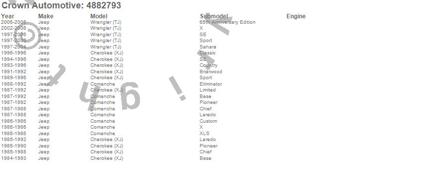 Crown Automotive is the premier manufacturer and distributor of quality replacement parts for Jeep® CJ™, Wrangler™, Cherokee™, Grand Cherokee™, Liberty™, and Commander™."From humble beginnings in 1963 in a small Boston storefront, Crown Automotive has consistently maintained its commitment to offering only quality parts and exceptional service. Today, with warehouses in Massachusetts, Georgia, Nevada, Spain, and the Czech Republic, totaling over 160,000 square feet, Crown Automotive continues to be the leader in quality replacement parts for Jeep® vehicles. With over 8,000 different parts in stock for Jeep® vehicles from 1942 on up, Crown has the largest stock of replacement parts for Jeep® vehicles, including factory-discontinued parts. In fact, many of the older Jeeps are still on (and off) the road thanks to Crown parts. The Crown line consists of axle, body, brake, clutch, cooling, driveline, electrical, engine, exhaust, fuel, steering, suspension, transmission and transfer case components. Crown Automotive also offers an exclusive line of component kits and accessory products. Because we know that Jeeps are driven harder than most other vehicles, we emphasize offering only quality parts. In fact, we test parts on Jeeps before distributing them to our dealers to insure that they meet our standards for quality. Crown also supports its entire line with a 12 month/12,000 mile warranty to insure our dealers and their customers of our commitment to offering quality parts. We know from experience that Jeep® owners would rather pay a little more for a good quality part that's backed by a strong guarantee. But we know that price is important as well. So, not only will you find Crown parts to be of exceptional quality, but you'll find them at a great price too.