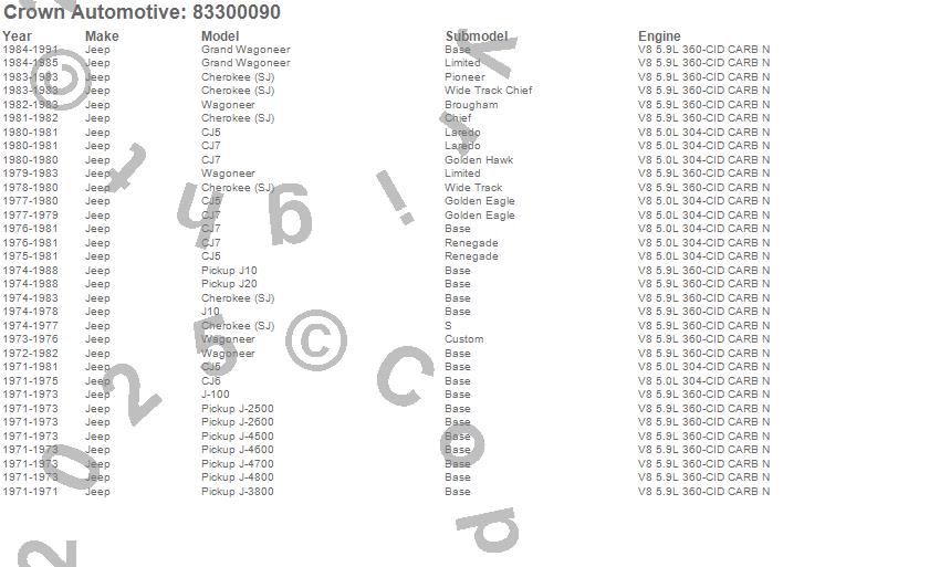 Cherokee (SJ), CJ5, CJ6, CJ7, Grand Wagoneer, J-100, J-2500, J-2600, J-3800, J-4500, J-4600, J-4700, J-4800, J10, J20, Wagoneer, Jeep, 1991, 1990, 1989 more…