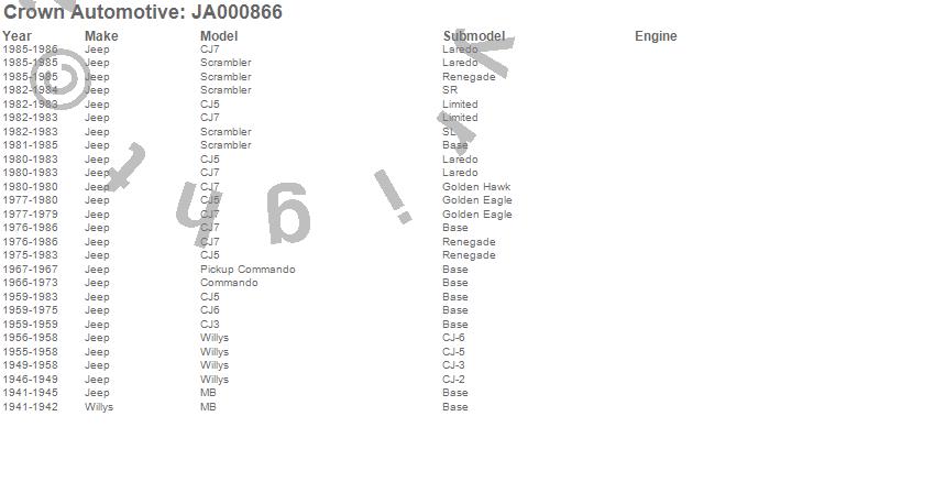 Crown Automotive is the premier manufacturer and distributor of quality replacement parts for Jeep® CJ™, Wrangler™, Cherokee™, Grand Cherokee™, Liberty™, and Commander™."From humble beginnings in 1963 in a small Boston storefront, Crown Automotive has consistently maintained its commitment to offering only quality parts and exceptional service. Today, with warehouses in Massachusetts, Georgia, Nevada, Spain, and the Czech Republic, totaling over 160,000 square feet, Crown Automotive continues to be the leader in quality replacement parts for Jeep® vehicles. With over 8,000 different parts in stock for Jeep® vehicles from 1942 on up, Crown has the largest stock of replacement parts for Jeep® vehicles, including factory-discontinued parts. In fact, many of the older Jeeps are still on (and off) the road thanks to Crown parts. The Crown line consists of axle, body, brake, clutch, cooling, driveline, electrical, engine, exhaust, fuel, steering, suspension, transmission and transfer case components. Crown Automotive also offers an exclusive line of component kits and accessory products. Because we know that Jeeps are driven harder than most other vehicles, we emphasize offering only quality parts. In fact, we test parts on Jeeps before distributing them to our dealers to insure that they meet our standards for quality. Crown also supports its entire line with a 12 month/12,000 mile warranty to insure our dealers and their customers of our commitment to offering quality parts. We know from experience that Jeep® owners would rather pay a little more for a good quality part that's backed by a strong guarantee. But we know that price is important as well. So, not only will you find Crown parts to be of exceptional quality, but you'll find them at a great price too.