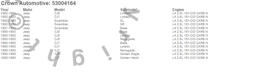 Crown Automotive is the premier manufacturer and distributor of quality replacement parts for Jeep® CJ™, Wrangler™, Cherokee™, Grand Cherokee™, Liberty™, and Commander™."From humble beginnings in 1963 in a small Boston storefront, Crown Automotive has consistently maintained its commitment to offering only quality parts and exceptional service. Today, with warehouses in Massachusetts, Georgia, Nevada, Spain, and the Czech Republic, totaling over 160,000 square feet, Crown Automotive continues to be the leader in quality replacement parts for Jeep® vehicles. With over 8,000 different parts in stock for Jeep® vehicles from 1942 on up, Crown has the largest stock of replacement parts for Jeep® vehicles, including factory-discontinued parts. In fact, many of the older Jeeps are still on (and off) the road thanks to Crown parts. The Crown line consists of axle, body, brake, clutch, cooling, driveline, electrical, engine, exhaust, fuel, steering, suspension, transmission and transfer case components. Crown Automotive also offers an exclusive line of component kits and accessory products. Because we know that Jeeps are driven harder than most other vehicles, we emphasize offering only quality parts. In fact, we test parts on Jeeps before distributing them to our dealers to insure that they meet our standards for quality. Crown also supports its entire line with a 12 month/12,000 mile warranty to insure our dealers and their customers of our commitment to offering quality parts. We know from experience that Jeep® owners would rather pay a little more for a good quality part that's backed by a strong guarantee. But we know that price is important as well. So, not only will you find Crown parts to be of exceptional quality, but you'll find them at a great price too.