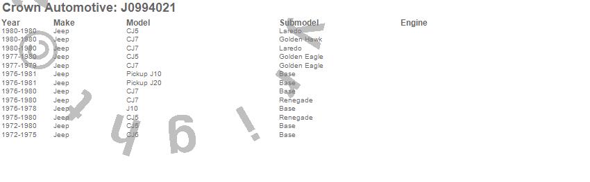 Crown Automotive is the premier manufacturer and distributor of quality replacement parts for Jeep® CJ™, Wrangler™, Cherokee™, Grand Cherokee™, Liberty™, and Commander™."From humble beginnings in 1963 in a small Boston storefront, Crown Automotive has consistently maintained its commitment to offering only quality parts and exceptional service. Today, with warehouses in Massachusetts, Georgia, Nevada, Spain, and the Czech Republic, totaling over 160,000 square feet, Crown Automotive continues to be the leader in quality replacement parts for Jeep® vehicles. With over 8,000 different parts in stock for Jeep® vehicles from 1942 on up, Crown has the largest stock of replacement parts for Jeep® vehicles, including factory-discontinued parts. In fact, many of the older Jeeps are still on (and off) the road thanks to Crown parts. The Crown line consists of axle, body, brake, clutch, cooling, driveline, electrical, engine, exhaust, fuel, steering, suspension, transmission and transfer case components. Crown Automotive also offers an exclusive line of component kits and accessory products. Because we know that Jeeps are driven harder than most other vehicles, we emphasize offering only quality parts. In fact, we test parts on Jeeps before distributing them to our dealers to insure that they meet our standards for quality. Crown also supports its entire line with a 12 month/12,000 mile warranty to insure our dealers and their customers of our commitment to offering quality parts. We know from experience that Jeep® owners would rather pay a little more for a good quality part that's backed by a strong guarantee. But we know that price is important as well. So, not only will you find Crown parts to be of exceptional quality, but you'll find them at a great price too.