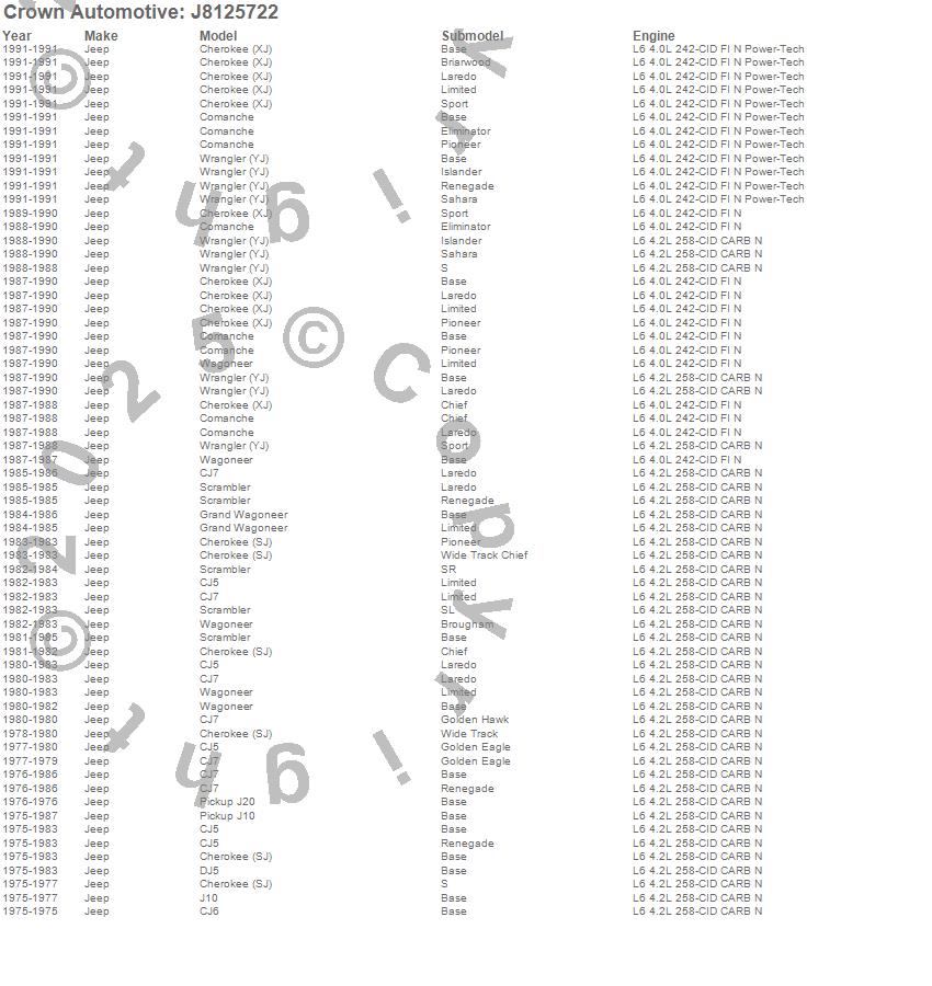 Crown Automotive is the premier manufacturer and distributor of quality replacement parts for Jeep® CJ™, Wrangler™, Cherokee™, Grand Cherokee™, Liberty™, and Commander™."From humble beginnings in 1963 in a small Boston storefront, Crown Automotive has consistently maintained its commitment to offering only quality parts and exceptional service. Today, with warehouses in Massachusetts, Georgia, Nevada, Spain, and the Czech Republic, totaling over 160,000 square feet, Crown Automotive continues to be the leader in quality replacement parts for Jeep® vehicles. With over 8,000 different parts in stock for Jeep® vehicles from 1942 on up, Crown has the largest stock of replacement parts for Jeep® vehicles, including factory-discontinued parts. In fact, many of the older Jeeps are still on (and off) the road thanks to Crown parts. The Crown line consists of axle, body, brake, clutch, cooling, driveline, electrical, engine, exhaust, fuel, steering, suspension, transmission and transfer case components. Crown Automotive also offers an exclusive line of component kits and accessory products. Because we know that Jeeps are driven harder than most other vehicles, we emphasize offering only quality parts. In fact, we test parts on Jeeps before distributing them to our dealers to insure that they meet our standards for quality. Crown also supports its entire line with a 12 month/12,000 mile warranty to insure our dealers and their customers of our commitment to offering quality parts. We know from experience that Jeep® owners would rather pay a little more for a good quality part that's backed by a strong guarantee. But we know that price is important as well. So, not only will you find Crown parts to be of exceptional quality, but you'll find them at a great price too.